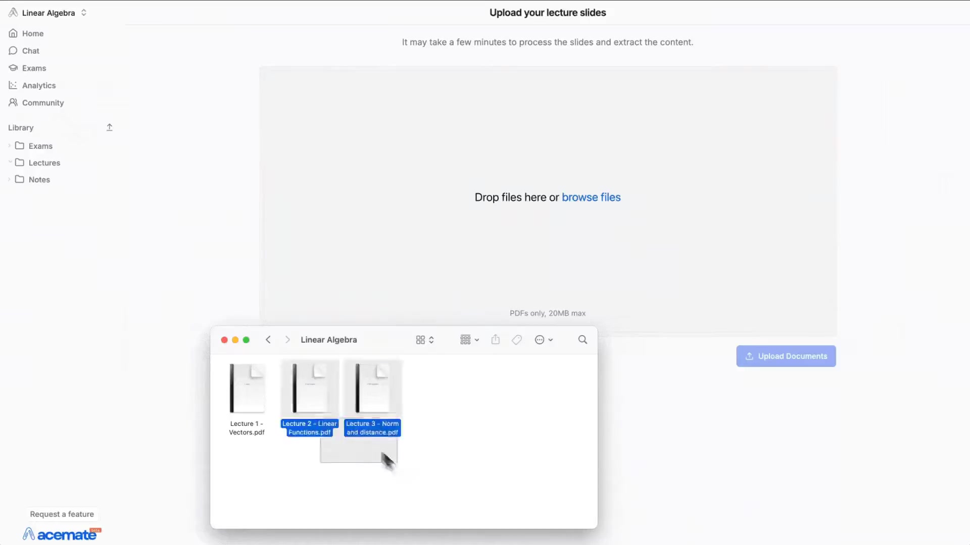 Upload your lecture slides, textbooks, exercises or previous exams – acemate analyzes the content and automatically creates interactive learning paths tailored to your students' needs.